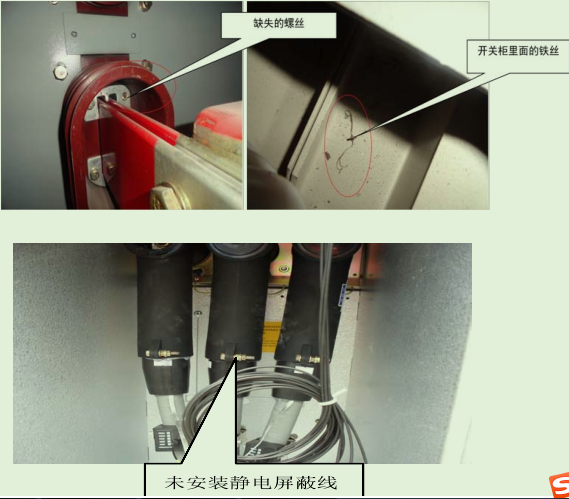 在我們的現(xiàn)場(chǎng)檢測(cè)中發(fā)現(xiàn)多起由于施工質(zhì)量所導(dǎo)致的局放現(xiàn)象,例如,未安裝靜電屏蔽線、缺少螺絲、柜內(nèi)有異物、安裝間距過小等多種多樣。